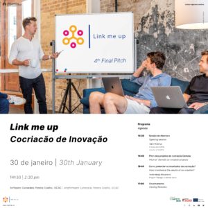 O INOPOL Academia de Empreendedorismo do Politécnico de Coimbra vai promover o “Final Pitch” da 4.ª edição do programa Link Me Up – Cocriação de Inovação, no dia 30 de janeiro, pelas 14:30 horas, no Anfiteatro Esmeralda Pereira Coelho da Coimbra Business School do Politécnico de Coimbra.