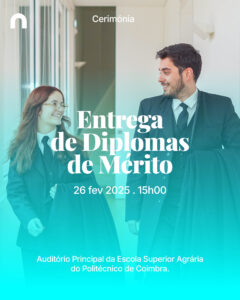 A Cerimónia de Entrega de Diplomas de Mérito a estudantes do Politécnico de Coimbra terá lugar a 26 de fevereiro, no Auditório Principal da Escola Superior Agrária de Coimbra, com o objetivo de destacar e valorizar o mérito escolar destes estudantes.