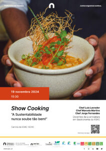 👨‍🍳 Se tens curiosidade sobre como reduzir o desperdício na confeção das tuas refeições, o Chefs Luís Lavrador, Marcela Martins e Jorge Fernandes estarão à tua espera com soluções deliciosas na cantina ESAC-ISCAC, terça-feira, dia 19 de novembro, pelas 15h30.
